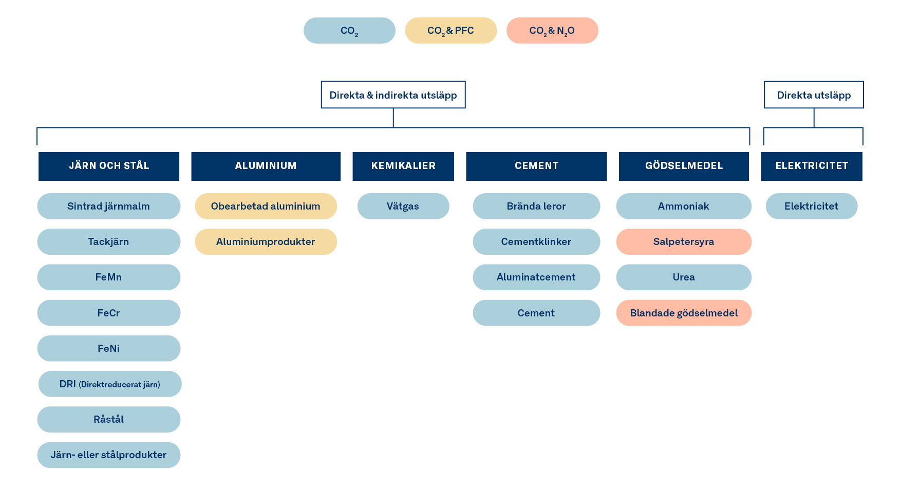 Denna uppdelning gäller under övergångsperioden och kan eventuellt komma att ändras till den definitiva fasen som börjar 2026. Informationen i bilden kommer från Tabell 1 bilaga II i CBAM-genomförandeförordningen: