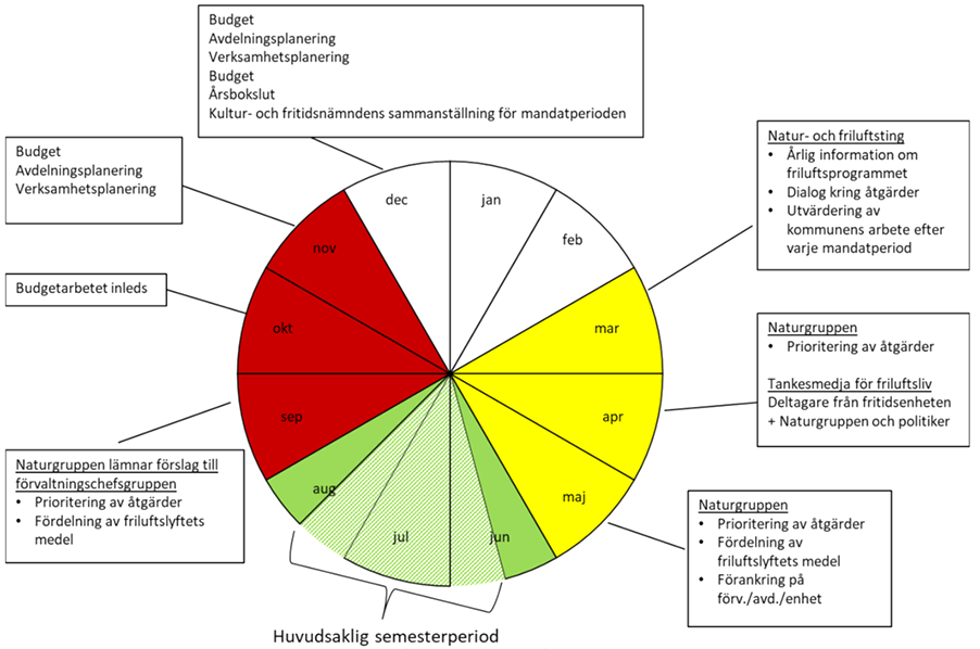 Nedan är en beskrivning av hur Örnsköldsvik har lagt upp sitt friluftslivsarbete över året för att säkerställa genomförande, uppföljning och uppdatering av arbetet.