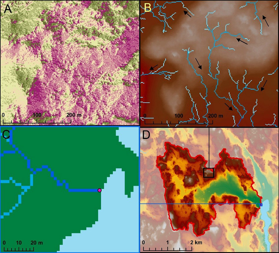 Beräknad flödesriktning utifrån höjdskillnader (A), hur flödet ackumuleras till vissa områden (B), avrinningsområdets utlopp (C) och avrinningsområdets avgränsning i rött (D).