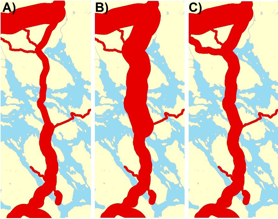 Årsdygnstrafik för A) nuläget, B) verksamhetens byggtid och C) efter verksamhetens byggtid. De olika vägsträckornas bredd i figuren är proportionerlig mot antalet passerande fordon ett genomsnittligt dygn.