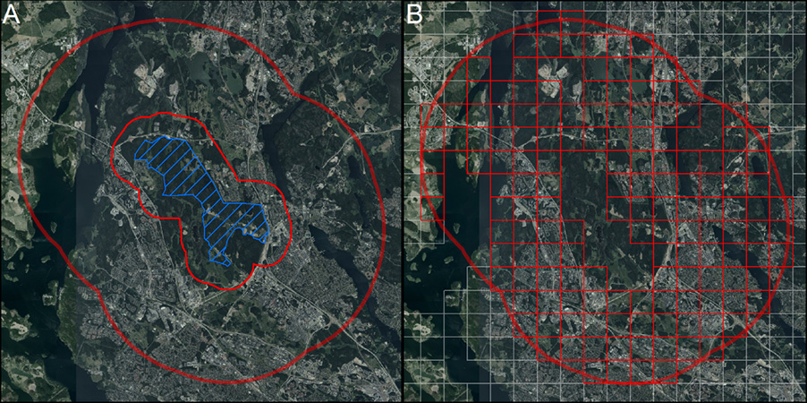 I bild A har Östra Järvafältets naturreservat (blåskrafferat) buffrats med en och fem kilometer (inre respektive yttre röd linje). Rutnätet i bild B är i 1x1 kilometer i upplösning och innehåller befolkningsdata. Befolkningsantalet i de rutor som ligger inom bufferten (röda) summeras och visar att cirka 220 000 människor bor inom fem kilometer från reservatet.