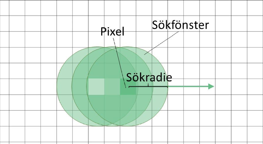 Bildbeskrivning: Täthetsberäkning pixel för pixel med ett rörligt sökfönster (illustration (modifierad) från Bovin M., Elcim, E., Wennberg, S., 2017a. Landskapsanalys av skogliga värdekärnor i boreal region. Metria AB på uppdrag av Naturvårdsverket. Preliminär slutrapport.)