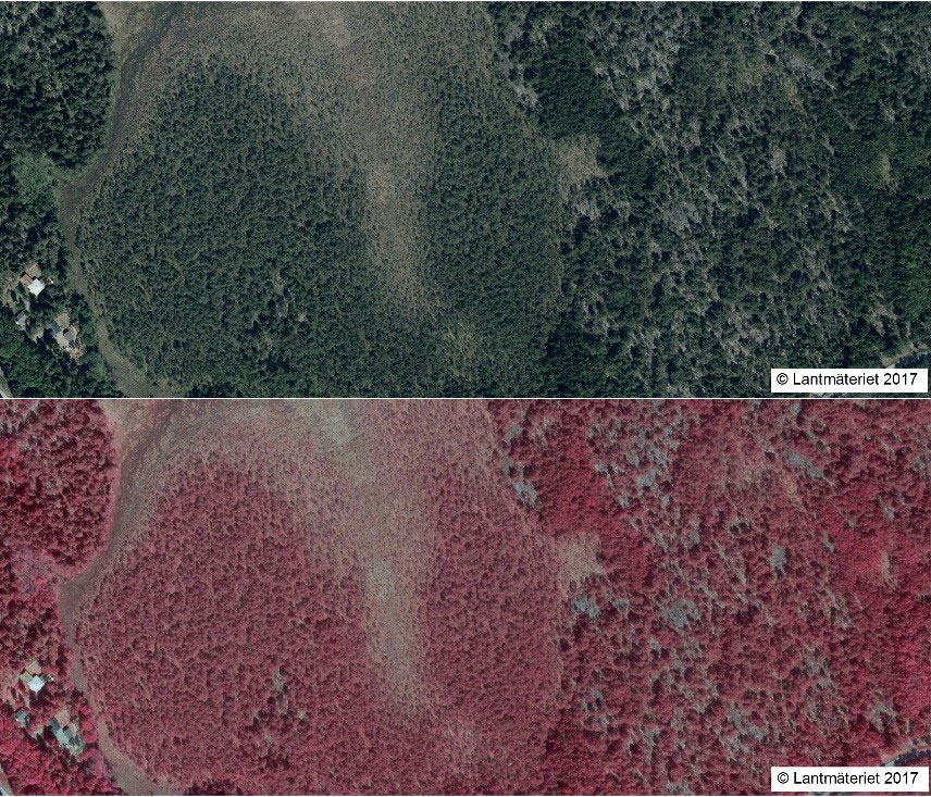 Bildbeskrivning: Överst ett ortofoto (0,25 meters upplösning) över Stormossen, Ingarö. Den nedre bilden visar samma område i ett infrarött ortofoto (0,5 meters upplösning). I IR-färgbilder blir barrträd mörk grön/röda och lövträd ljusröda. Foto: Lantmäteriet.