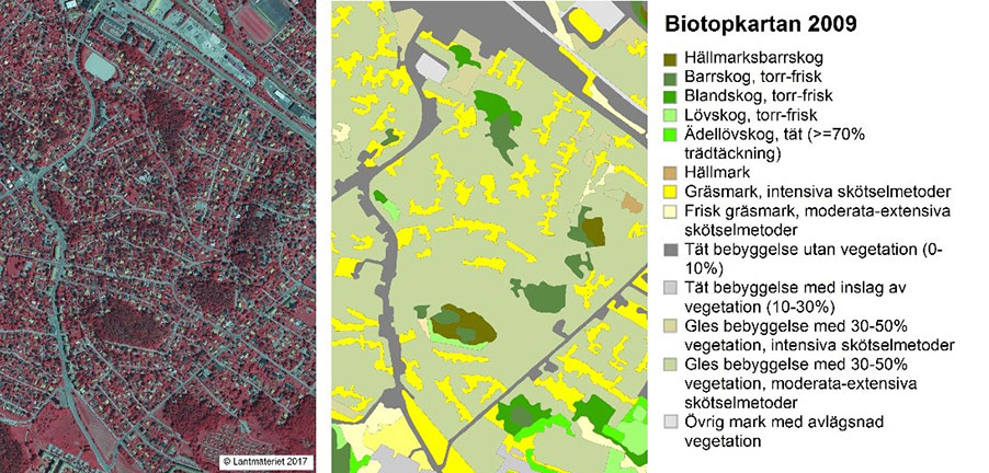 Bildbeskrivning: Till vänster ett infrarött ortofoto och till höger ett utsnitt ur Stockholms stads Biotopkartan för samma område. Foto: Lantmäteriet.