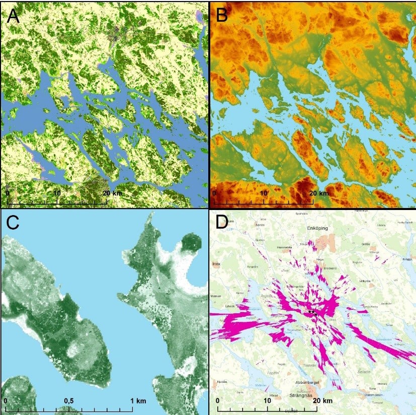 Höjdmodellen som analyserna är baserade på visas som bakgrund i B, C och D (hög höjd är gråbrun och låg höjd är gröngul).